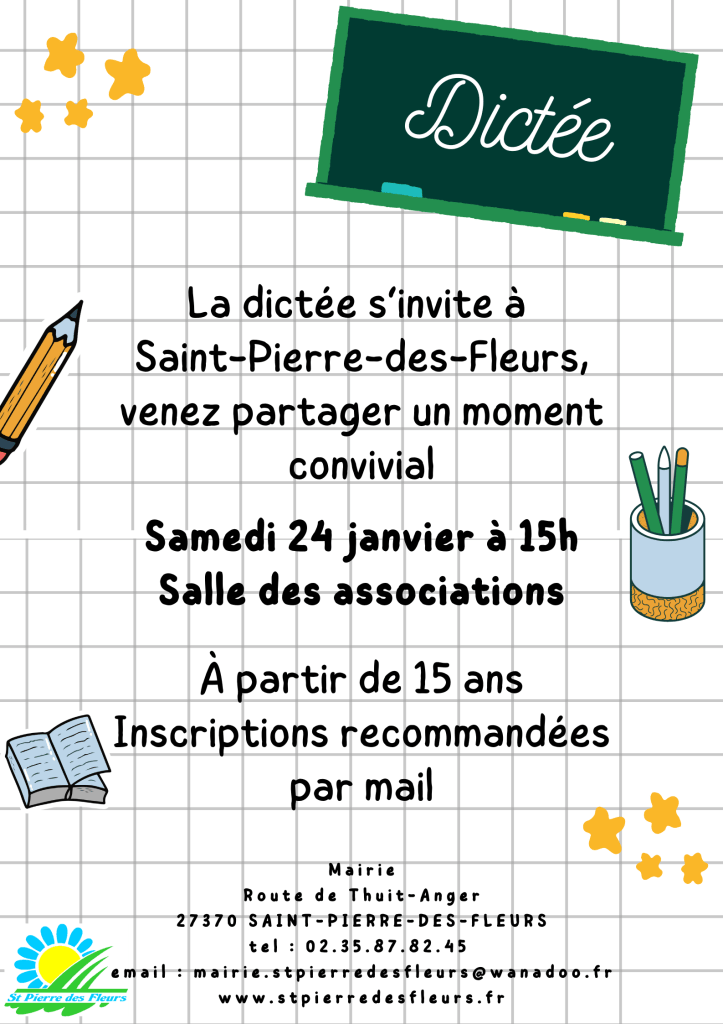 Rendez-vous le samedi 24 janvier à 15h pour une dictée ouverte à tous, dans notre belle commune de Saint-Pierre-des-Fleurs !