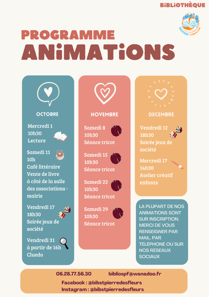 Animation bibliothèque Publié parMairie de Saint-Pierre-des-Fleursoctobre 6, 2023septembre 26, 2025Publié dansBibliothèque Retrouvez notre programme d’animation : Partager : Email a link to a friend(ouvre dans une nouvelle fenêtre) E-mail Partager sur Facebook(ouvre dans une nouvelle fenêtre) Facebook Partager sur WhatsApp(ouvre dans une nouvelle fenêtre) WhatsApp J’aime chargement… Similaire